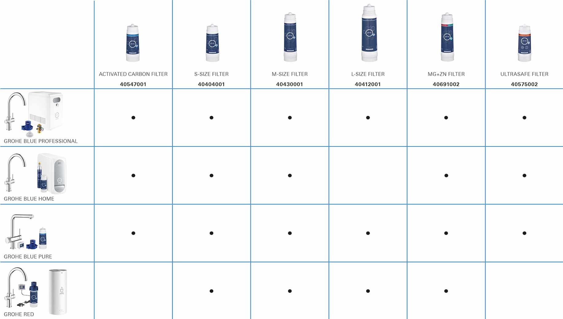 - kompatibel med GROHE Blue Home, GROHE Blue Professional, GROHE Blue Pure (kun med strømningsmåler) og GROHE Red